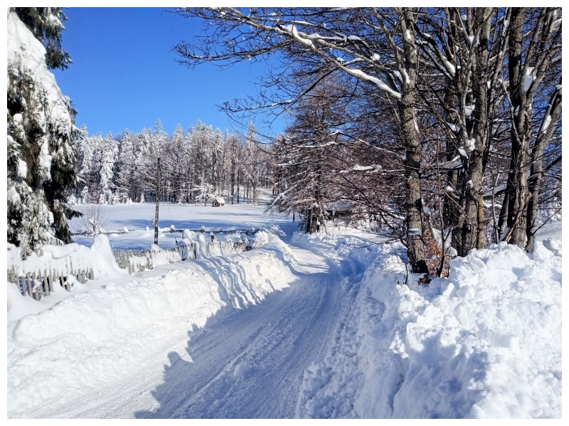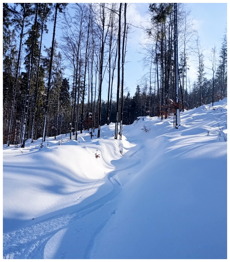 Niedziela 5.03: Rysianka, start z Sopotni. W nocy trochę dopadało. Od parkingu dobrze jest przenieść narty przez 200 m. Później rozpoczyna się prawdziwa zima. Śnieg w okolicy starego wyciągu i niebieskiego szlaku fenomenalny. 10 cm miękkiego i dosyć nowego śniegu na starym podkładzie. Lipowska średnia. Beton przykryty 2 cm świeżego. Dla odmiany północny stok z Lipowskiego w stronę Żabnicy bardzo przyjemny. Można pojeździć w młodniaku i stromymi, wąskimi przecinkami. Aż skusiłem się na dwa zjazdy. Powrót z Rysianki przez polanę, las do drogi. Chyba najlepsze 300 m zjazdu w ten weekend. Można dojechać prawie na parking, ale radzę uważać na słabo przykryte kamyczki.