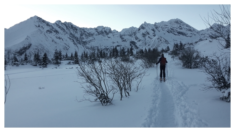 - Banikowska Przełęcz, sama góra zjazdu super, niżej bliżej dna doliny raczej ok, ale czasem można wjechać na zalodzone/twarde (podeszliśmy też na Pachoła ale bez nart, grań do przełęczy możliwa do zjazdu, ale raczej bez większych przyjemności)